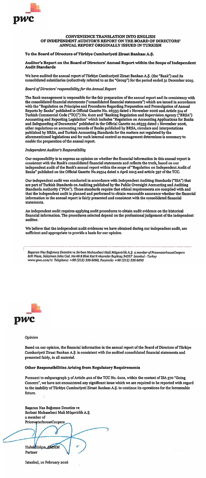 - Publicly Announced Unconsolidated Financial Statements together with Independent Auditor’s Report at 31 December 2015