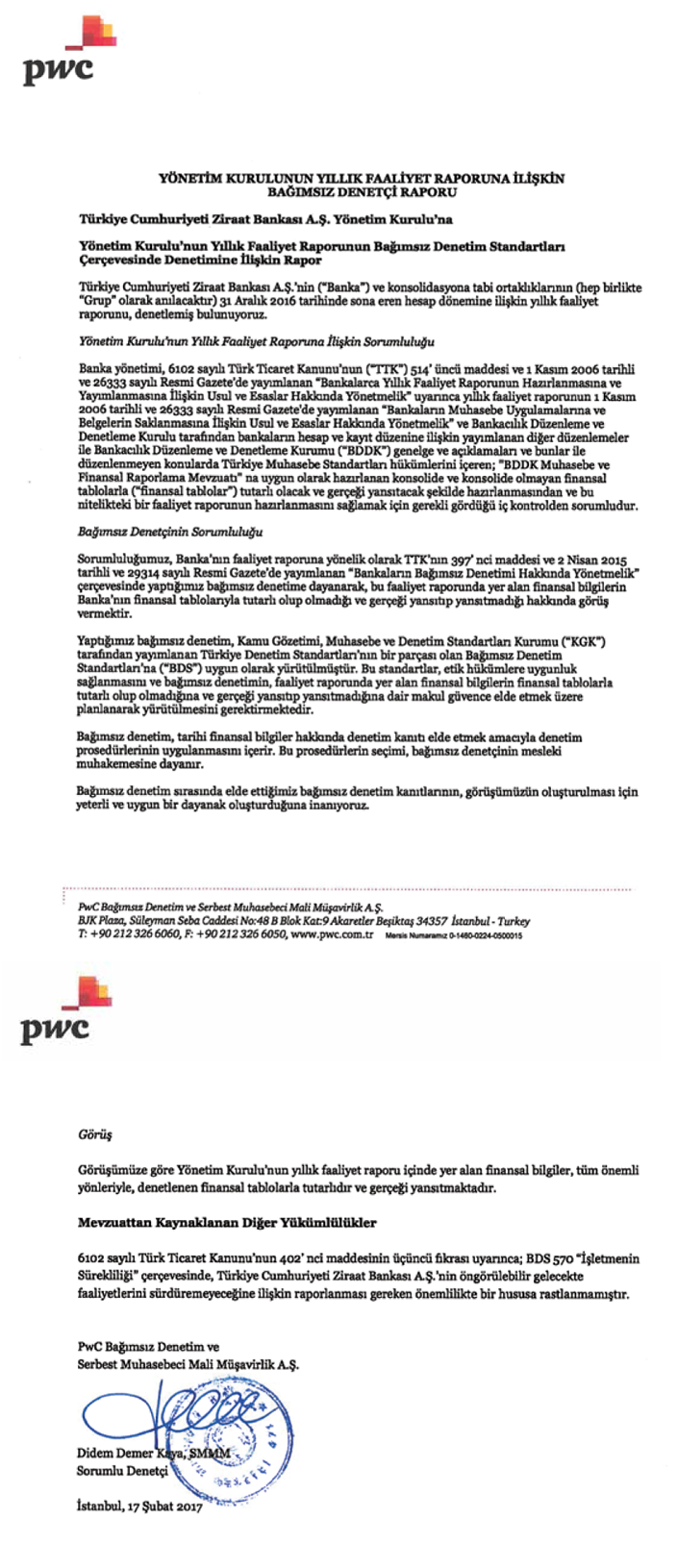 - 31 Aralık 2016 Tarihi İtibarıyla Hazırlanan Kamuya Açıklanacak Konsolide Olmayan Finansal Tablolar, Bunlara İlişkin Açıklama ve Dipnotlar ile Bağımsız Denetim Raporu