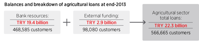 Seeking to be a customer’s primary and proactive bank in all aspects of agricultural production up to and including the final consumer, Ziraat Bank continued to support the sector in many different ways last year. At end-2013, the total value of all Ziraat Bank lending to the agricultural sector amounted to TRY 22.3 billion while the number of its loan customers stood at 566,665.
