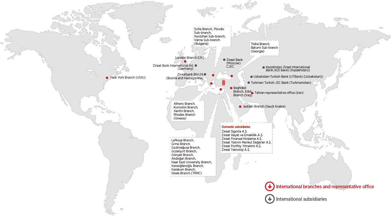 With branches, subsidiaries, and representatives at 85 locations in 16 different countries, Ziraat Bank continues to strengthen its position as the Turkish bank whose direct global reach is more extensive than that of any other bank in Turkey.