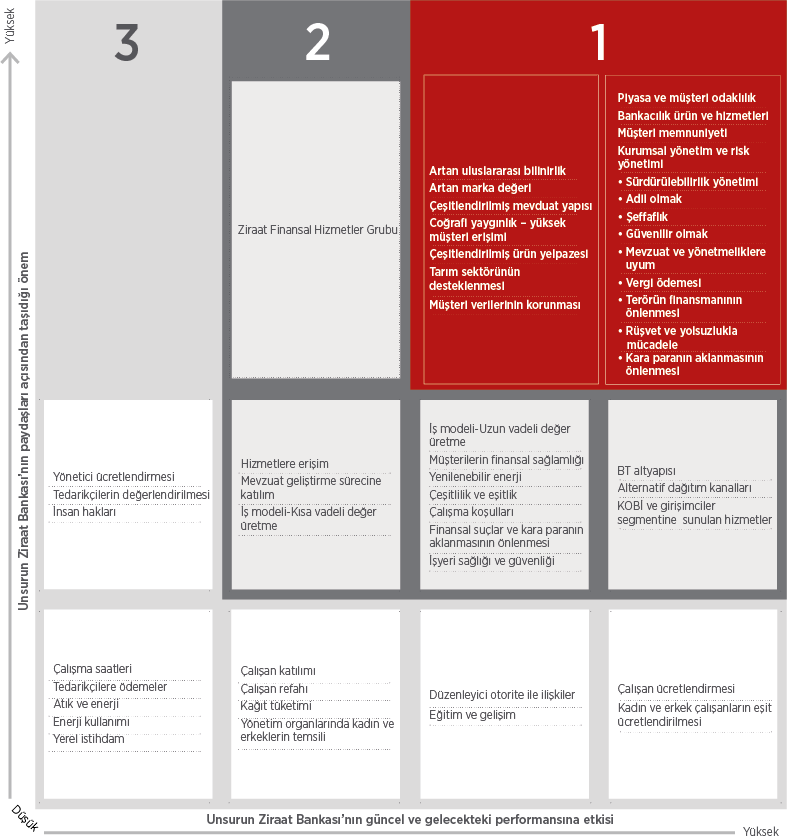 2014 yılı önceliklendirme analizi sonucunda belirlenmiş olan tüm öncelikli unsurlar, gerek Ziraat Bankası gerekse paydaşları açısından önemlidir ve güçlü bir etkiye sahiptir. Öncelikli unsurları, önem ve etki alanları açısından üç kategoride ele almak mümkündür: