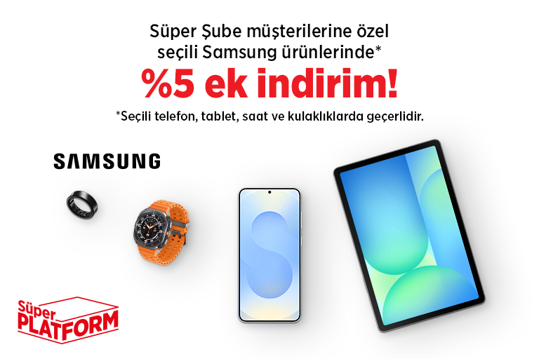 Süper Şube müşterilerine özel seçili Samsung marka telefon, tablet, kulaklık ve saat ürünlerinde tüm indirimlere ek %5 indirim fırsatı!
